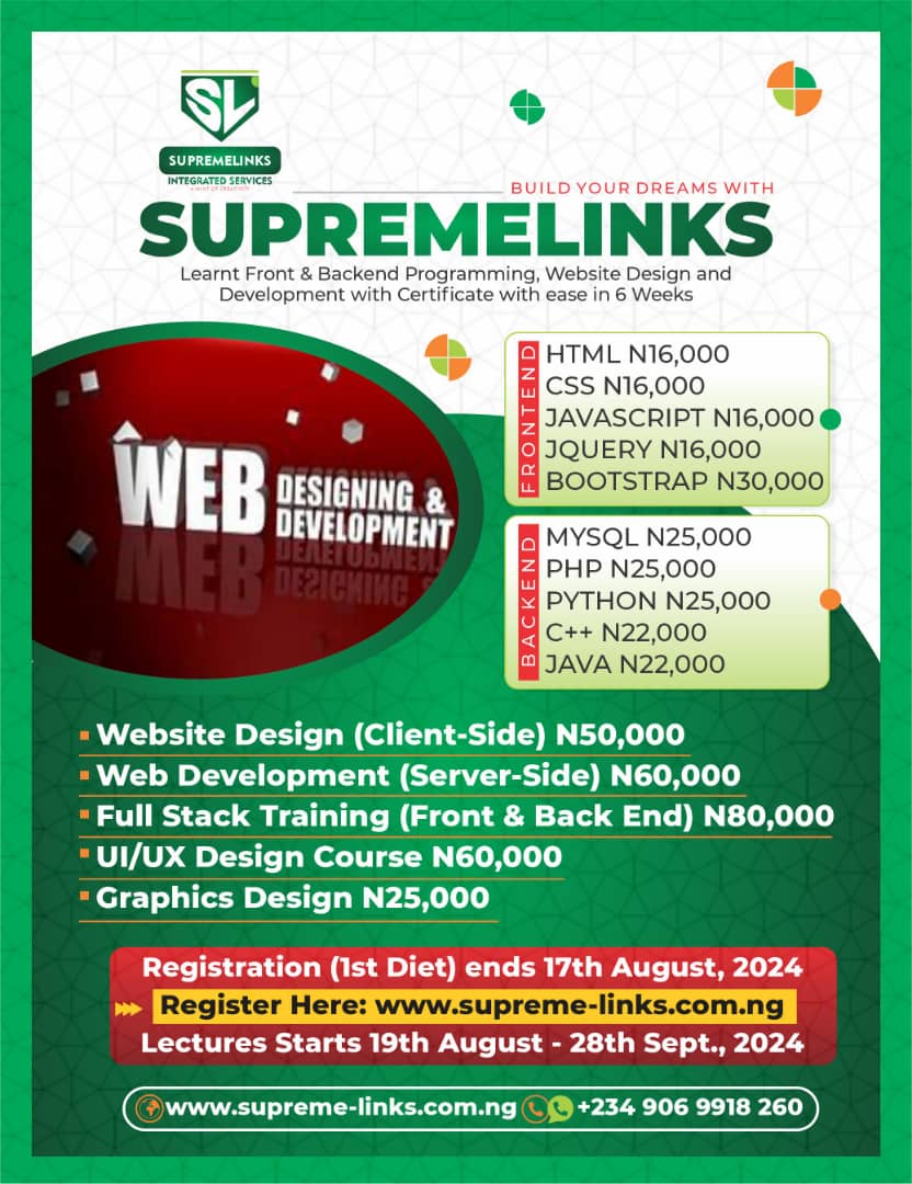 WEB DESIGN SERVICES is the process of conceptualizing, planning, and building websites and web apps Web design encompasses many different skills and disciplines in the world of design, development, and website maintenance such as front-end design and development, graphic design, usability, and performance optimization. SUPREMELINKS INTEGRATED SERVIVES OFFERS Website Creation Design and Development, Web Security Protection, Hosting and Management Services.